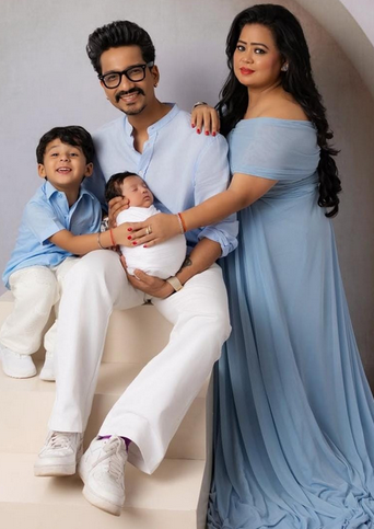 The dreamy pictures feature Bharti, husband Haarsh Limbachiyaa, their older son Laksh (aka Gola), and newborn Yashveer, lovingly called Kaju. Dressed in soft pastel tones, the family looks picture-perfect, with Haarsh cradling the baby while Laksh beams beside them.