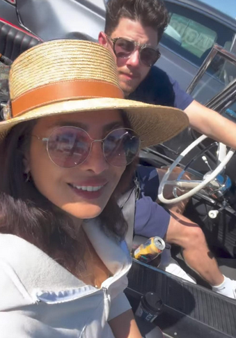 In the clip, Priyanka looks effortlessly chic in a white outfit, sunglasses, and a straw hat, smiling at Nick as he drives a vintage-style car in a navy T-shirt and aviators.