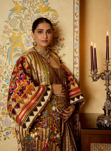 The actress, who is expecting her second child, shared glamorous photos on Instagram flaunting her baby bump in a chic golden outfit paired with a multicolored shrug. Styled by sister Rhea Kapoor, Sonam completed the look with a statement gold necklace, matching earrings, a neat bun, and soft, glowing makeup. “In full bloom for wedding season,” she captioned the post.