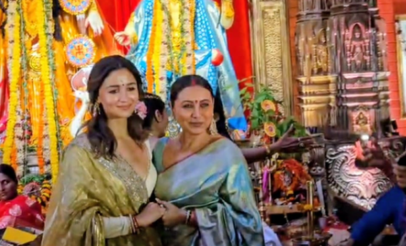 Mumbai– Bollywood’s Durga Puja celebrations just got a double dose of glamour! Alia Bhatt turned heads in a dazzling golden saree as she joined Rani Mukerji at the iconic North Bombay Durga Puja Pandal.