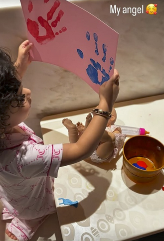 On her Instagram Stories, Priyanka posted a photo of Malti proudly holding up a chart with her tiny red and blue handprints. Beside her sat a bucket of paint and a doll—proof that art time was in full swing. “My angel,” wrote Priyanka, melting hearts online.