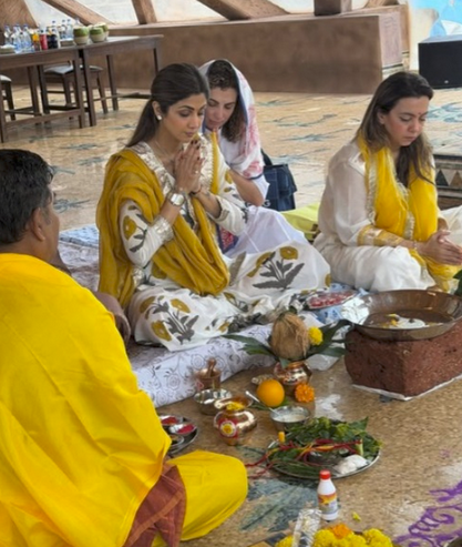 Dressed in a simple white printed salwar kameez, Shilpa was seen performing a yagna, marking the auspicious start of her newest venture.