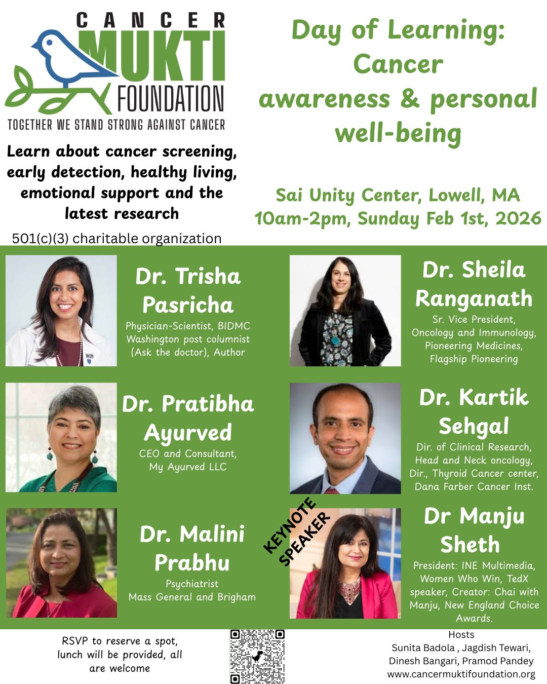 Dr. Trisha Pasricha will highlight actionable steps individuals can take to reduce cancer risk, emphasizing prevention, early detection, timely screening, and lifestyle awareness. The program will also examine the medical, cultural, and social implications of a cancer diagnosis, with Dr. Manju Sheth addressing the importance of culturally sensitive care and community dynamics in treatment and recovery.