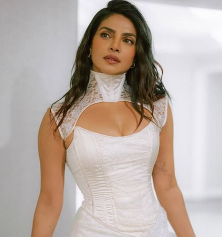 For the ceremony, Chopra wore a custom strapless white gown by Dior that reflected a classic Hollywood style with modern detailing. The dress featured a structured corset-style bodice that accentuated the waist and flowed into a long skirt with a dramatic thigh-high slit.